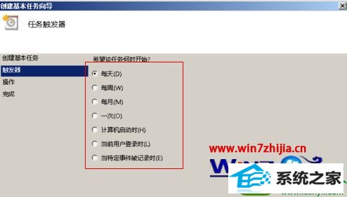 4、然后点击左侧的“触发器”,选择你想启动的周期,选择好之后点击下一步按钮;